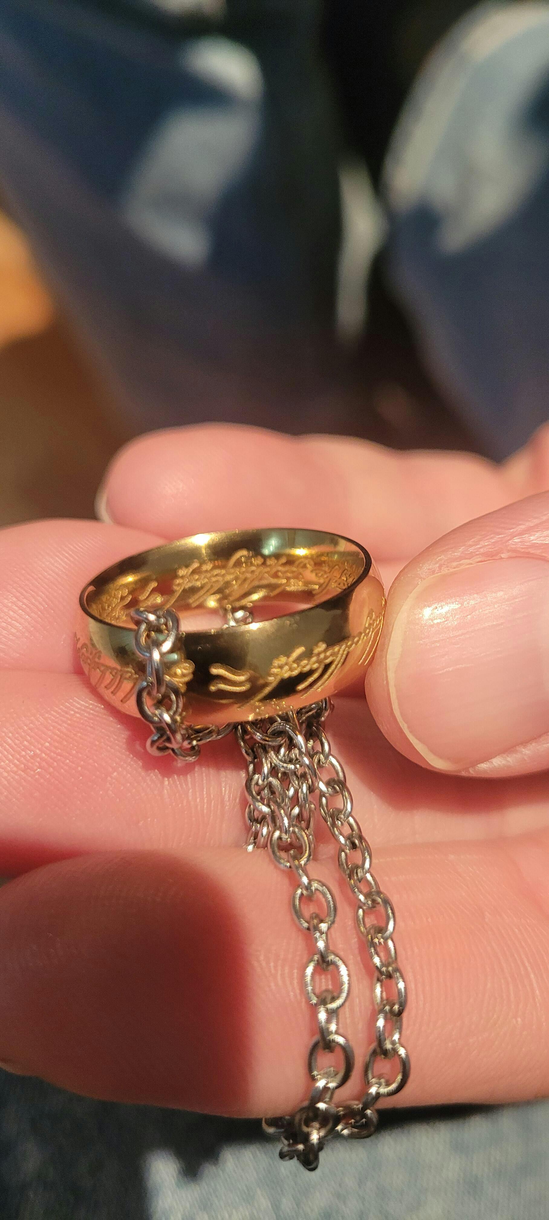 Muy buenos detalles, muy bonito y parece de buena calidad. El brillo del anillo es fantastico y la escritura muy buena y fina con mucho detalle. La cadena tambien se ve muy resistene. De momento encantado con mi tesoro.