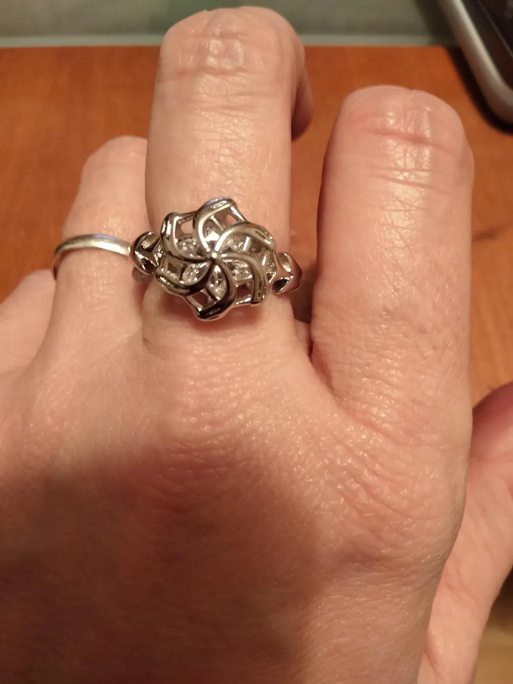 El anillo igual a la descripción, es muy bonito. En mi caso me queda un poco grande el mediano, pero lo he solucionado poniendo un adaptador. Muy recomendable la compra.